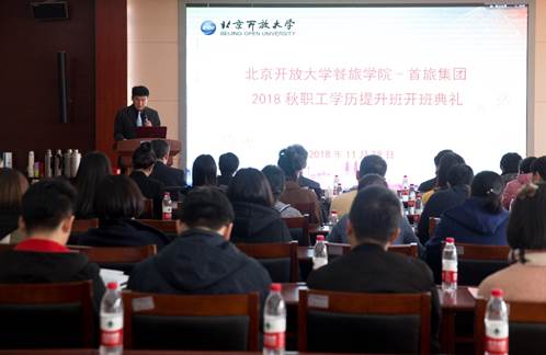首旅集团党校副校长、培训中心主任宋扬先生,在典礼上做了讲话,介绍了首旅集团未来的人才发展战略,对学员提出了殷切希望,表示将与学院深化合作,齐心协力将本届学历提升班打造成为首旅集团员工学历教育示范班。