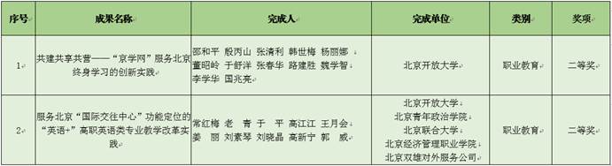 今年6月,我校已喜获10项北京市教育教学成果奖,其中含职业教育教学成果奖特等奖一项、二等奖四项,高等教育教学成果奖一等奖一项、二等奖一项,基础教育教学成果奖二等奖一项,作为第二申报单位获职业教育教学成果奖一等奖一项、二等奖一项。