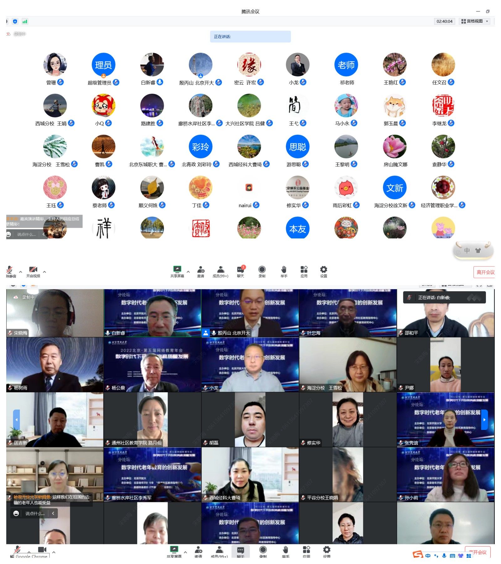 各位与会专家学者代表不同层次的办学机构,以“数字时代老年教育的创新发展”为主题进行了交流分享,我国老年教育的资深专家叶忠海教授率先以“新时代中国老年教育发展的战略趋向”为题,对党的二十大以后老年教育的发展趋势进行了分析和研判,北京老年科技大学、丰台区社区学院、通州区宋庄镇成人技术学校、昌平区廊桥水岸社区分别作为市、区、乡镇(街道)、社区(村)四级办学体系的代表,向与会者汇报了各自开展老年教育的实践与体会。首开寸草养老服务有限公司作为养老机构的典型代表,把养老机构开展老年教育的实践做了经验交流。论坛最后,北京老年开放大学以“老年教育高质量发展的时代背景、服务模式与实践路径”为题,把未来老年教育发展需要协作会成员密切配合的八项重点工作作了分享交流。