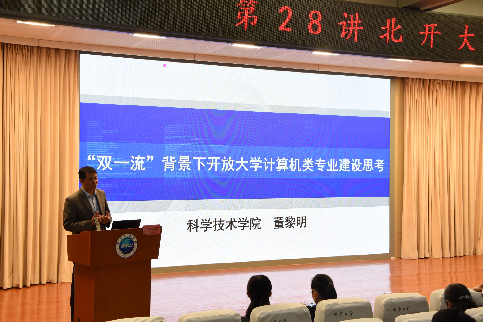 科学技术学院教授董黎明做了题为“‘双一流’背景下开放大学计算机类专业建设思考”的专题发言,他通过立足软件技术专业建设的工作全景,针对如何将计算机类专业和课程建出特色进行交流分享,分享了专业建设路线的思考探索与工作设想。