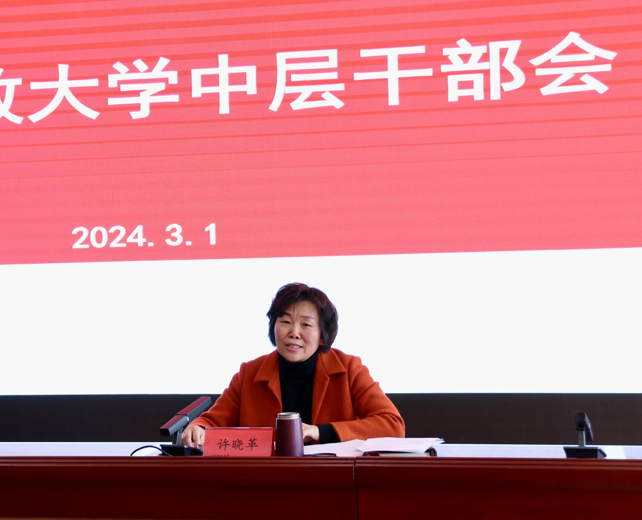 许晓革强调,今年是全面推动教育强国建设的开局之年,是实现“十四五”规划目标任务的关键一年,也是落实学校党员大会战略部署的开局之年。全体干部要聚焦学校年度工作要点,层层分解目标任务,突出重点、压实责任、强化落实,系统推进各项工作。一是坚持协同联动,抓好机构、干部调整和全员聘任工作,一体推进相关工作,形成良好运行秩序;二是加强业务整合,不断深化学历教育整合,优化办学体系结构,加强办学质量管理,强化非学历教育统筹,打造特色品牌项目,提升办学质量效益;三是强化支撑保障,持续推进数字化转型,加强师资队伍建设,强化科研和国际交流合作,提升学校治理效能,推进学校高质量发展;四是防范化解风险,确保校园安全稳定;五是纵深推进全面从严治党,以高质量党建引领高质量事业发展。