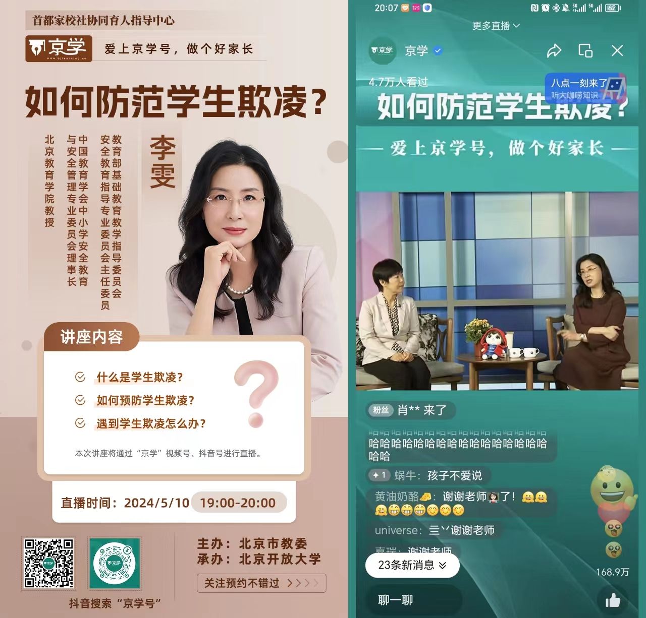 此次讲座由我校培训学院、终身教育处联合策划,共同承担直播活动组织与宣传推广,网络与数字资源中心提供支持,首次通过“京学”微信视频号和抖音号直播,7万余人在线观看。直播讲座中,评论区讨论热烈,专家就家长提出问题给予及时回应和有效指导。