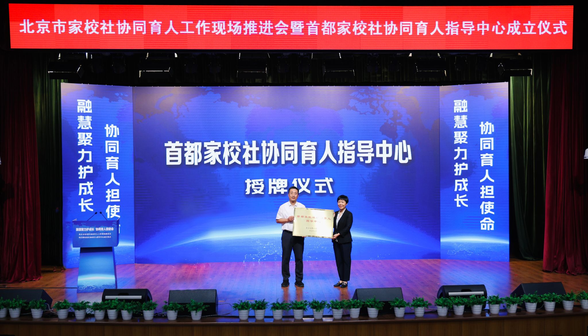 授牌仪式上,北京市教委副主任王攀为首都家校社协同育人指导中心授牌,华球平台党委委员、副校长赵军代表学校接牌。