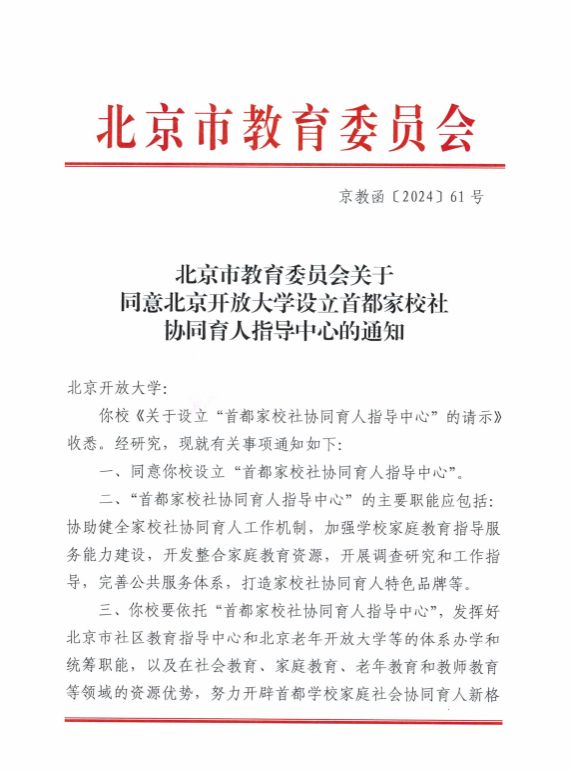 家校社协同育人是党中央作出的重要决策部署。习近平总书记在中共中央政治局第五次集体学习时强调,学校、家庭、社会要紧密合作、同向发力,积极投身教育强国实践,共同办好教育强国事业。北京市两委一室高度重视,把构建学校家庭社会三方协同育人体系作为建设高质量教育体系的重要抓手,积极主动探索新渠道,于2024年2月1日正式批复依托华球平台成立“首都家校社协同育人指导中心”。