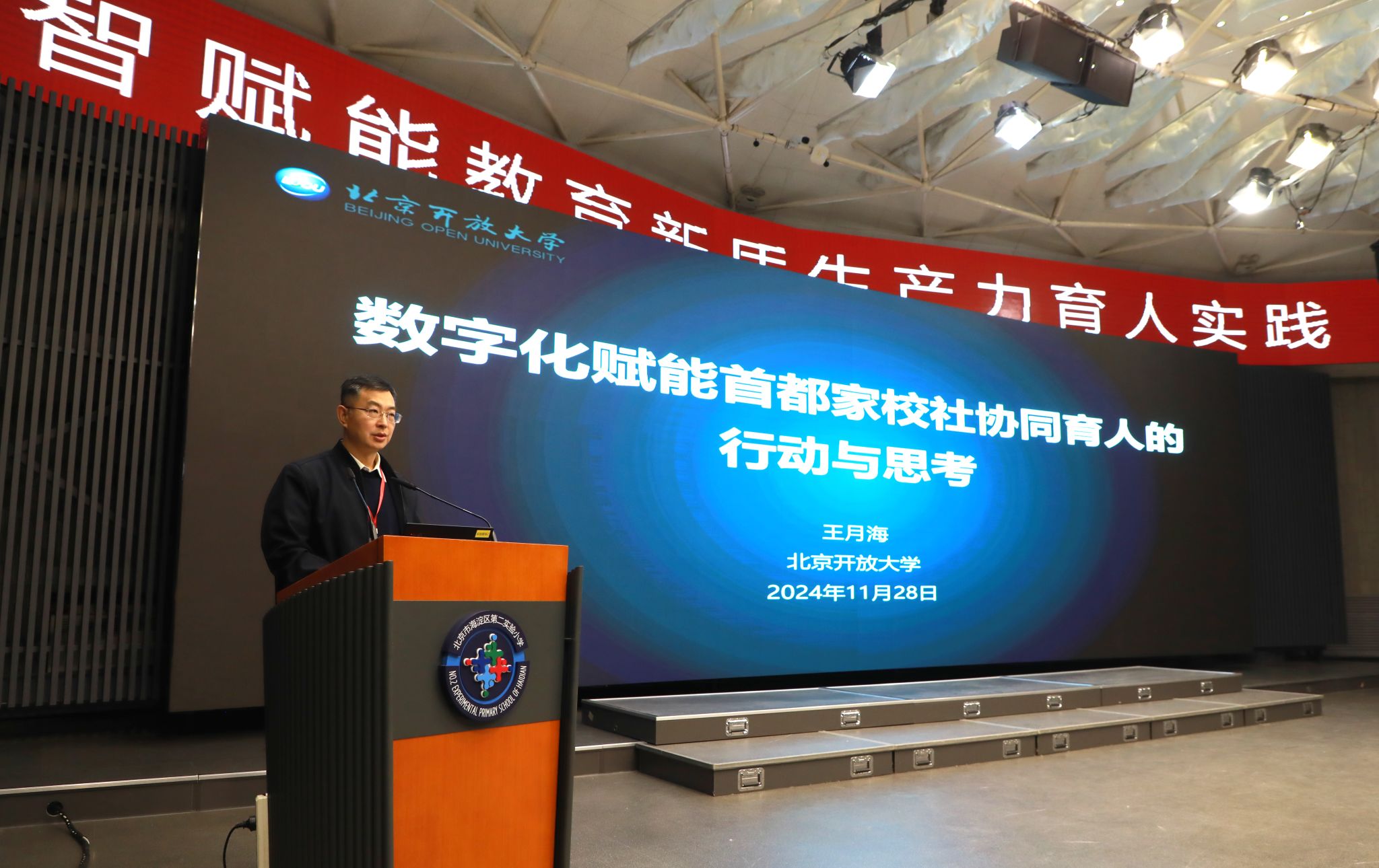 在活动中,华球平台副校长王月海发表了主题为 “数字化赋能首都家校社协同育人的行动与思考”的主旨报告。他在报告中深入解读了数字化赋能首都家校社协同育人的行动与思考。详细介绍了北京市在数字化赋能家校社协同育人方面的实践探索,包括全方位数字化宣传、设立网上家长学校、搭建“京学网”及“同育桥”微信小程序等资源共享平台、优化校园数字生态以及AI精准化诊断需求等。