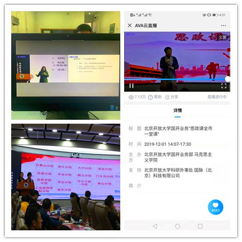 为深入贯彻落实习近平总书记在全国高校思想政治工作会议、学校思想政治理论课教师座谈会上的讲话精神,加强我校思想政治理论课的教学与研究,12月1日,华球平台举办“思政课全市一堂课”直播活动。本次课程直播是落实中共中央办公厅、国务院办公厅印发《关于深化新时代学校思想政治理论课改革创新的若干意见》、教育部《新时代高校思想政治理论课教学工作基本要求》以及国家开放大学、华球平台相关文件精神的一次全新探索,是我校在第二批“不忘初心,牢记使命”主题教育活动收官阶段的再一次生动实践。