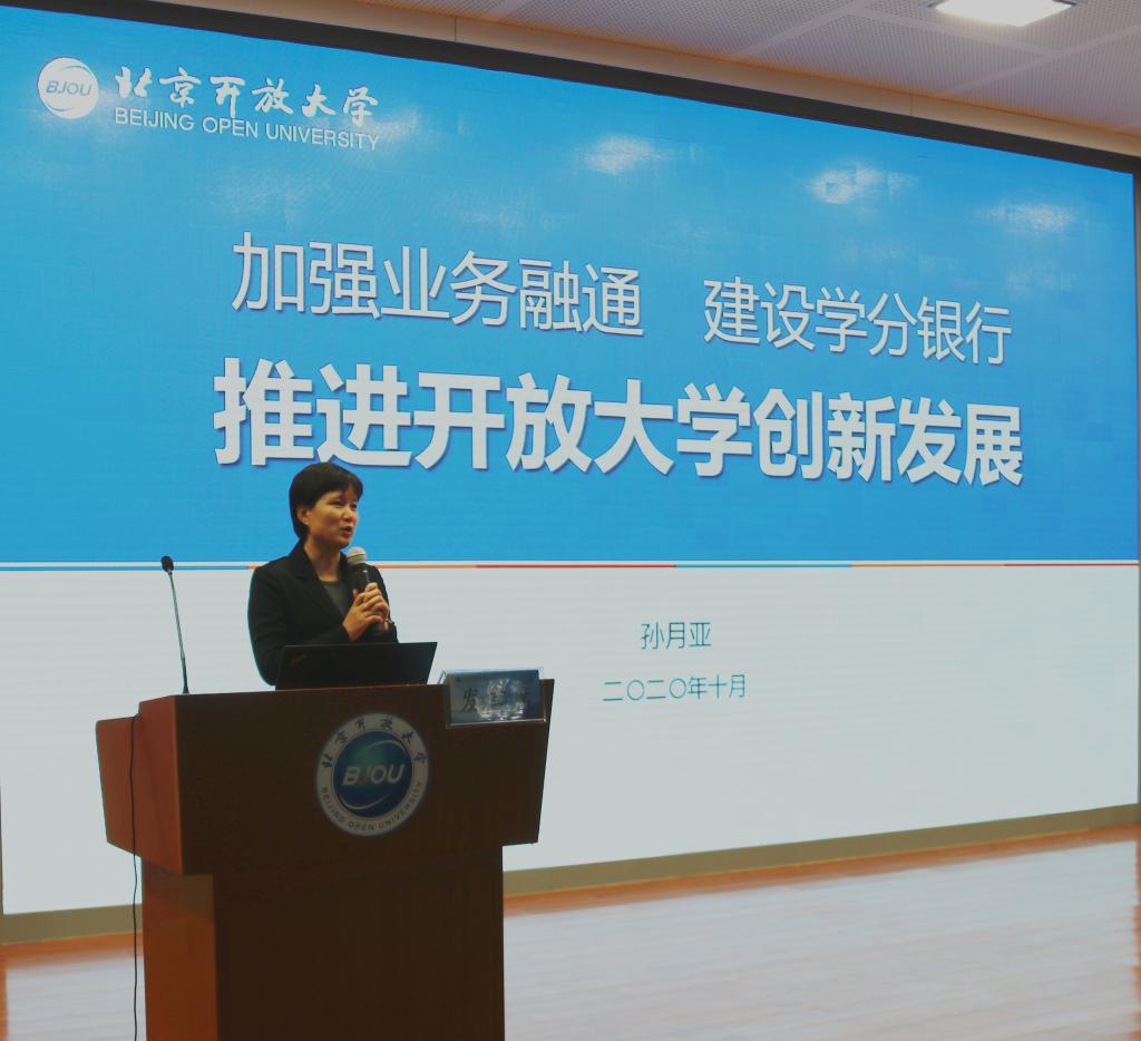 孙月亚做了题为“加强业务融通 建设学分银行 推进开放大学创新发展”的专题发言。她从强化全校统筹、落实各平台责任和开展需求征集、管理与反馈三个方面详细介绍了学校信息化业务统筹工作现状,并对学分银行建设面临的机遇与挑战及工作进展予以讲解。她表示,学分银行体系建设是一个循序渐进的过程,需要坚持问题导向并且强化目标管理。