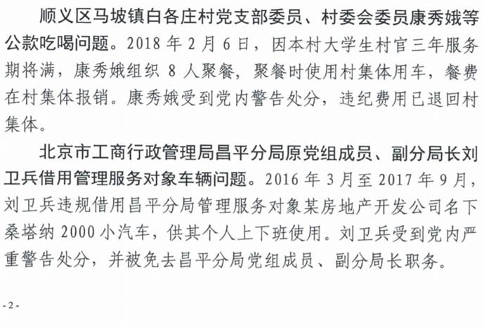 3.北京城建建设工程有限公司党委副书记、原纪委书记刘斌等人接受超标准接待、公款旅游等问题。2017年12月18日至21日,刘斌等一行3人赴该公司成都项目部检查工作。12月19日晚,刘斌等人接受该公司成都项目部的公务接待,违规饮用项目部提供的单价860元的高档白酒共5瓶,饮酒费用通过虚开发票降低单价等方式公款报销。12月20日晚,刘斌等人再次违规接受成都项目部公款宴请。此外,刘斌等人还存在违规使用公车到成都某景区参观游览、报销超标准用餐费用等问题。刘斌受到党内严重警告处分并被免去纪委书记职务。其他相关责任人受到相应处理。