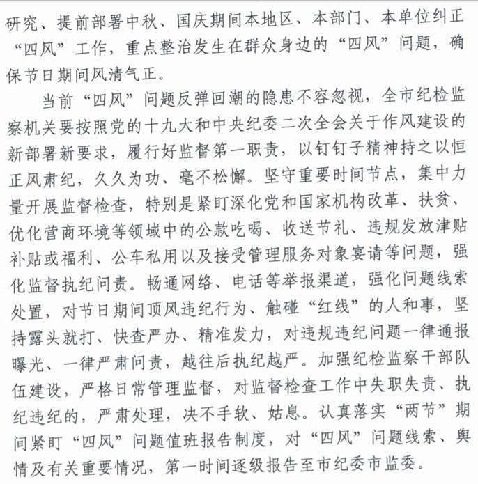 中央纪委有关负责人强调,中秋、国庆假期将至,违规公款吃喝、违规收送礼品礼金、公车私用、大办婚丧喜庆等“四风”问题易发,各级纪检监察机关要采取有力措施,盯住在培训中心和食堂等内部场所公务接待、公务用车使用管理、公款支出费用报销等关键环节,加强监督检查,对发现的节日期间“四风”问题,严查快处,共同营造风清气正的节日氛围。