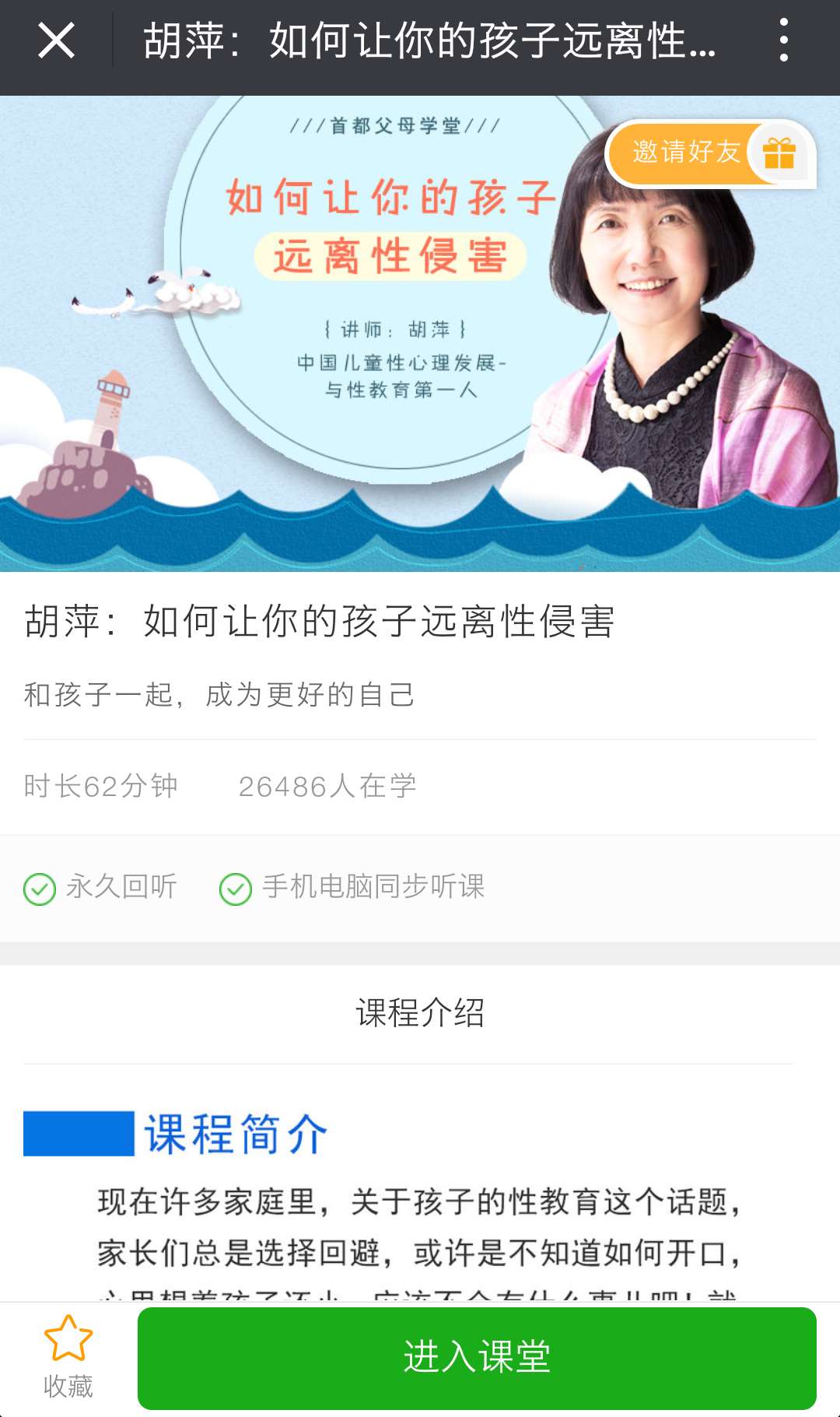 近期,“首都父母学堂”直播课程《如何让你的孩子远离性侵害》邀请了儿童性心理发展与性教育专家胡萍老师,围绕儿童性侵害防御这一热点话题,通过诸多案例,用详实的语言为广大父母听众上了生动的一课,听众达26486人。课程本着正确疏导、科学讲述的原则,内容聚焦家庭中的隐性性侵害、帮助孩子建构身体界限感、帮助孩子认识和保护身体隐私、孩子受到侵害后的行为和孩子受到侵害后家长应该如何做等五个家长们关心的热点问题,分析了家庭中常见的真实案例,科学的分析了这些看似亲昵的行为破坏了孩子的身体界限感。