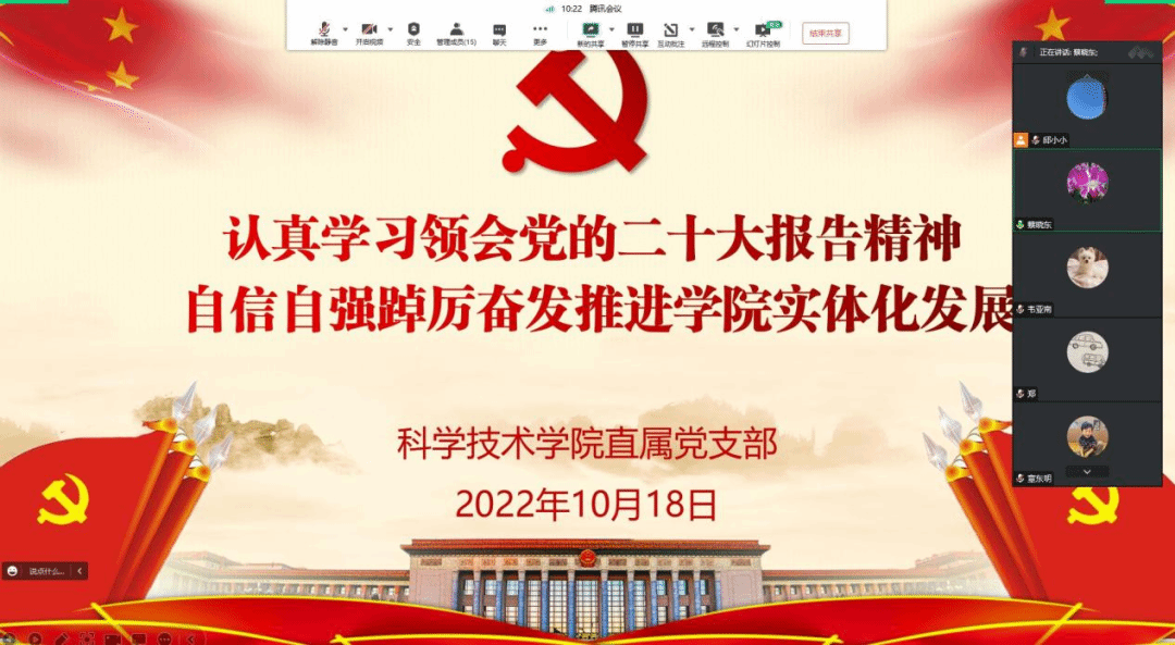 科学技术学院直属党支部以“认真学习领会党的二十大报告精神,自信自强踔厉奋发推进学院实体化发展”为主题开展线上学习研讨。大家纷纷表示,要把报告精神尽快落实到教学工作中。不忘初心,牢记使命,坚持立德树人,全面贯彻党的教育方针,将“小我”融入到祖国教育事业的“大我”当中,为首都教育事业努力工作。