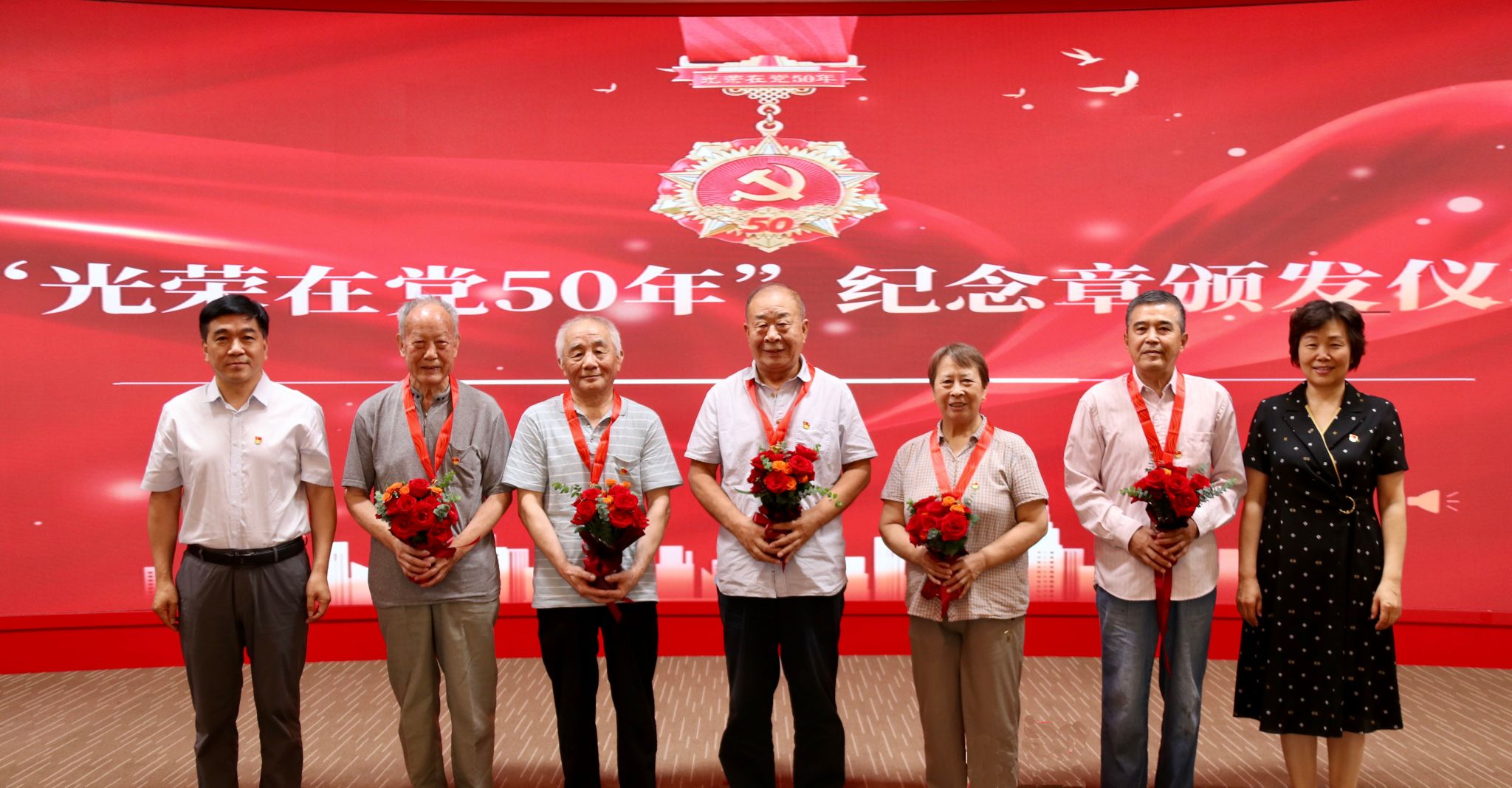 会上,许晓革、周启柏为“光荣在党50年”老党员赵国森、张文大、崔志旺、王玲芝、潘乃新颁发纪念章并献花。