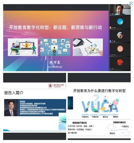 祝智庭教授是我国教育信息化理论与实践研究先行者,教育信息化系统架构与技术标准研制领军者,智慧教育理论与实践研究开创者,大规模教师在线教育质量保障研究首倡者,教育数字化转型研究引领者,属于高影响力人文与教育学者。祝教授深刻解读了当前数字化转型的时代背景和开放教育发展的外部生态,围绕数字化转型背景下开放教育新议题、开放教育数字化转型的新思维、开放教育数字化转型的行动建议等三个方面内容,结合国内外精彩案例的展示,对“创新+进化”为核心的数字化转型内涵、“数字化、智能化、终身化、融合化、生态化”所代表的开放教育发展趋势,以及多重挑战和机遇下开放教育数字化转型的发展路径等问题给出了独到的新见解、新观点和新思路。之后,祝教授还就数字化手段助力开放学习规模发展和个性化培育、开放大学数字校园建设等问题与我校教师进行了互动交流。