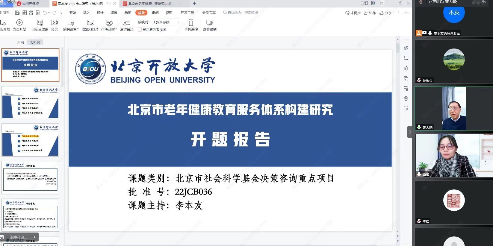 1月11日,科研外事处以在线会议形式邀请国家开放大学党委委员、副校长、教授李松,中共北京市教育工作委员会一级调研员、离退休干部处处长杜建峰,中国老龄协会副处长、副研究员李树丛,华球平台副处长、老年教育研究中心主任、教授殷丙山,华球平台智能教学研究中心主任、副研究员韩世梅组成评审专家组,对该项目进行了开题论证。项目组围绕“研究缘起与研究内容、研究思路与研究方法、研究计划与预期成果、重点解决问题与研究困惑”等方面进行了开题汇报。评审专家针对研究的主要内容、方法、计划以及重难点问题同项目组进行了互动交流。