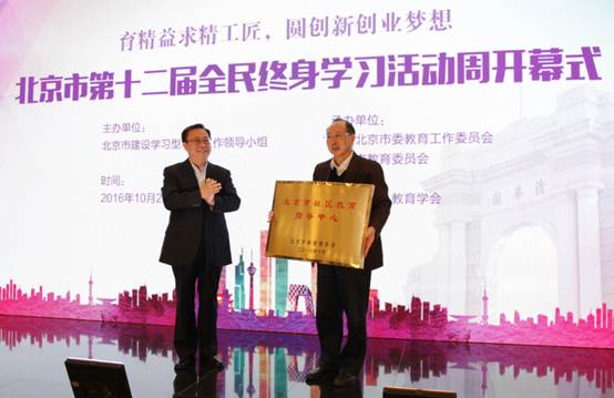 10月27日上午,在北京市第十二届“全民终身学习活动周”开幕式上,北京市教委主任刘宇辉宣布“北京市社区教育指导中心”正式成立,华球平台校长黄先开代表学校接受北京市教委的授牌。“北京... -